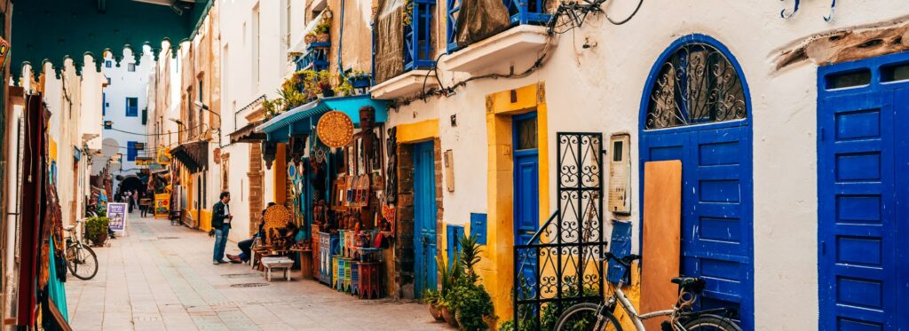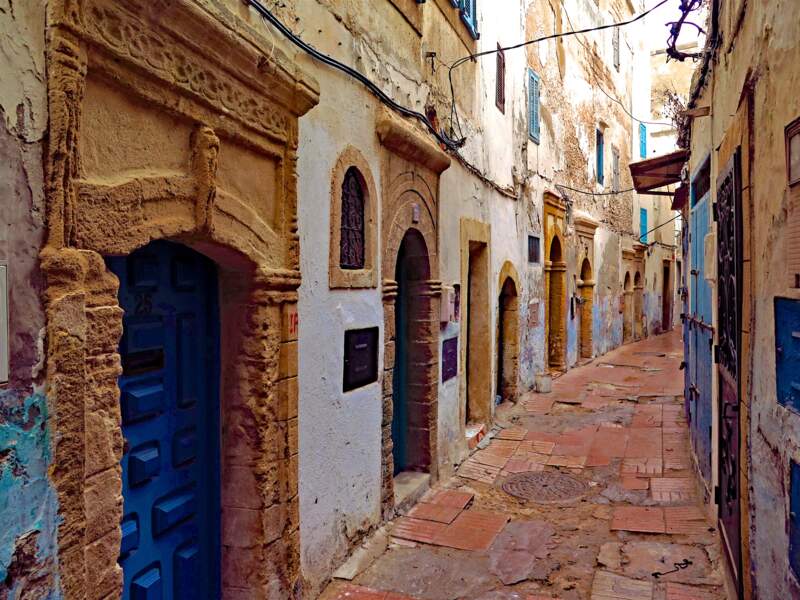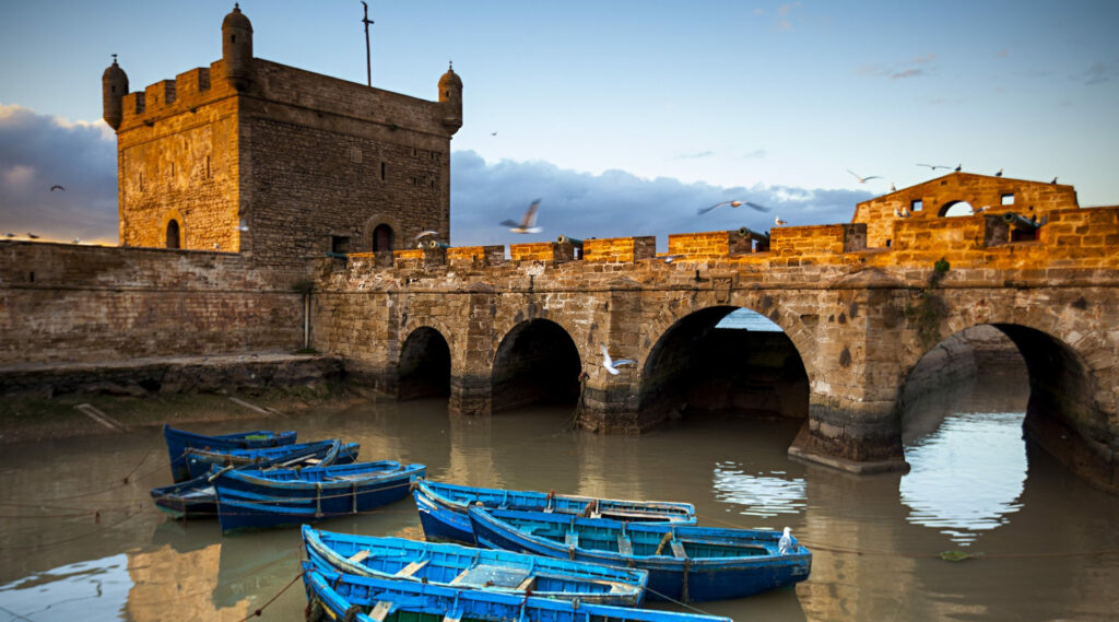 Essaouira ville portuaire auparavant appelée « Mogador » est une jolie ville blanche et bleue entourée de remparts où le port est un des lieux les plus pittoresques. Découvrir ses petites rues traditionnelles, son souk, ses galeries de peintures, les portes des remparts et surtout les vagues de l’océan qui se brisent avec force sur ses murailles ocres est un réel plaisir pour les yeux.